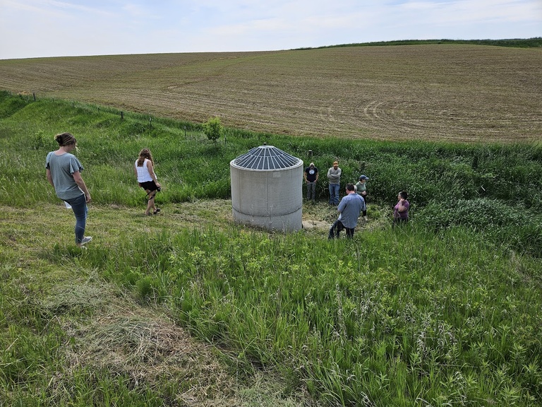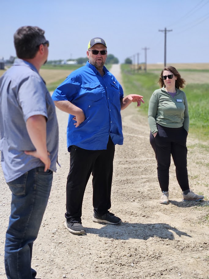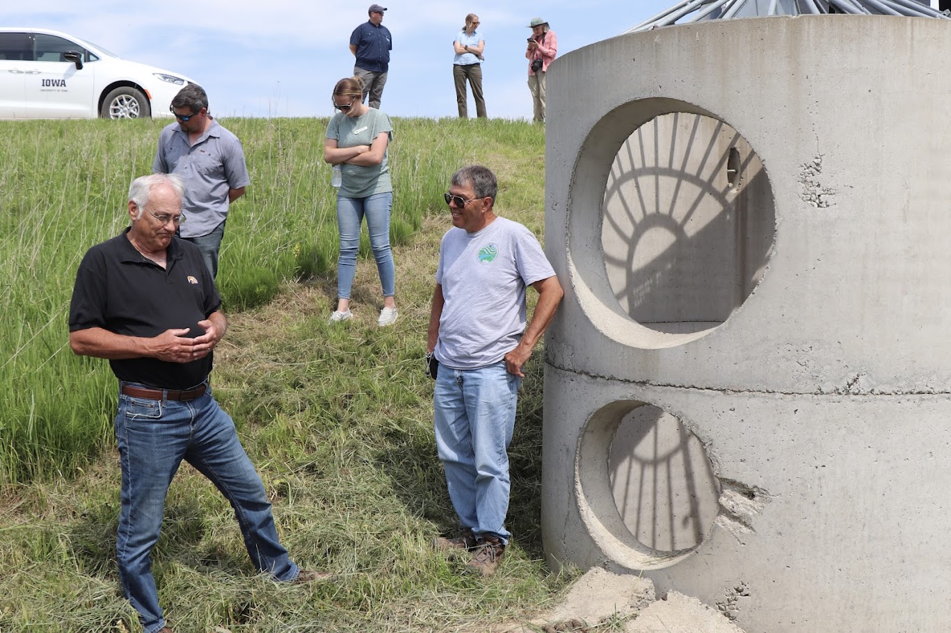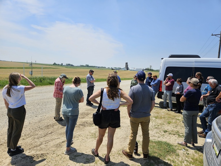 The group toured several sites in Postville, West Union, Elgin, and surrounding areas. Highlights included on-road structures pioneered in northeast Iowa, real-time stream sensors from the IFC's network, relay cropping at FLOLO Farms to boost soil health and reduce flooding, and a stream bank stabilization along the Yellow River. Each site sparked engaging discussions about the conservation value on the watershed and surrounding community.