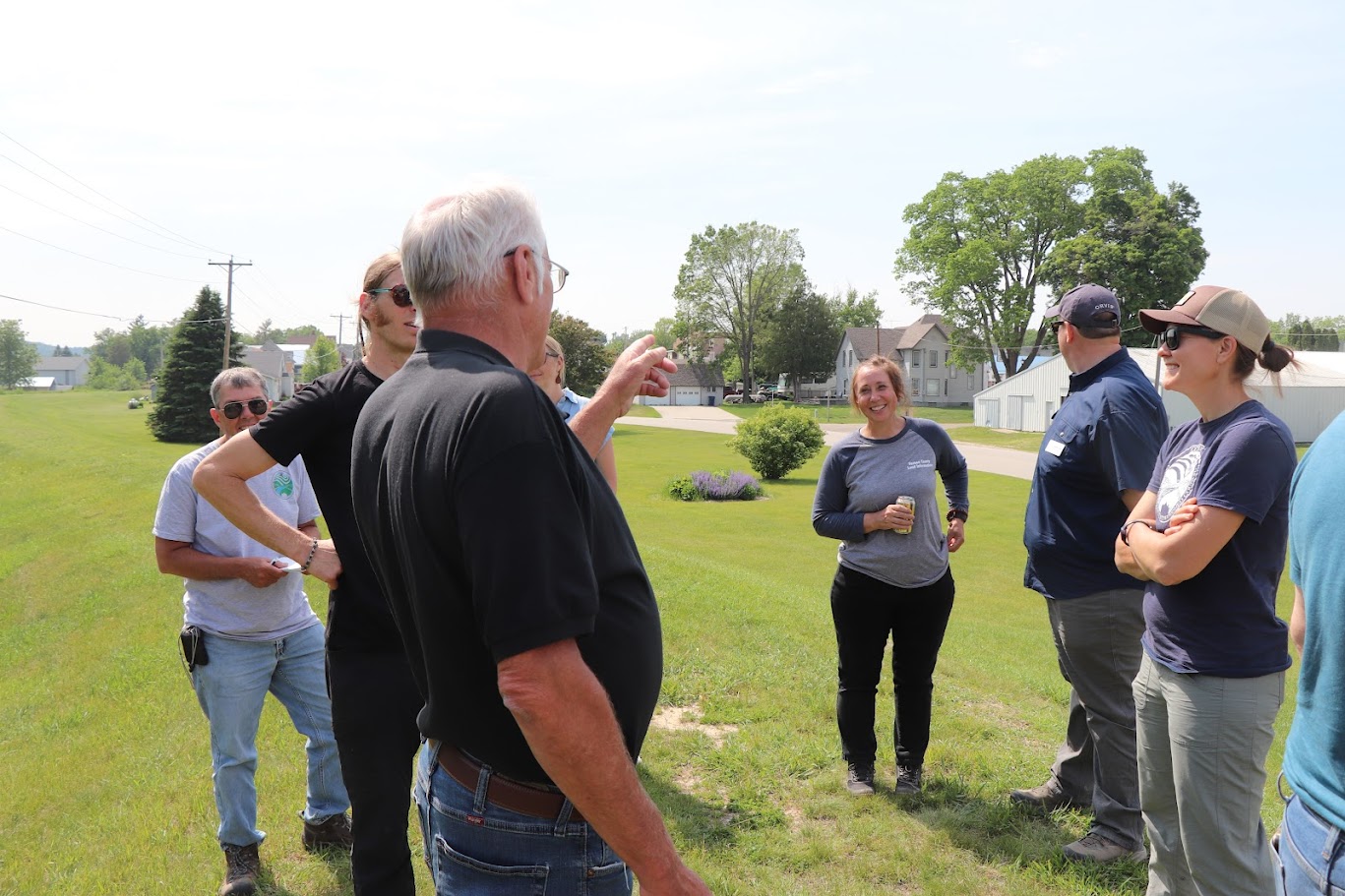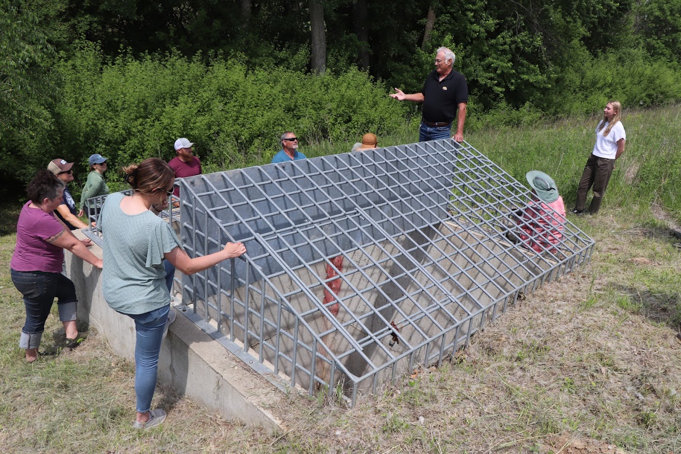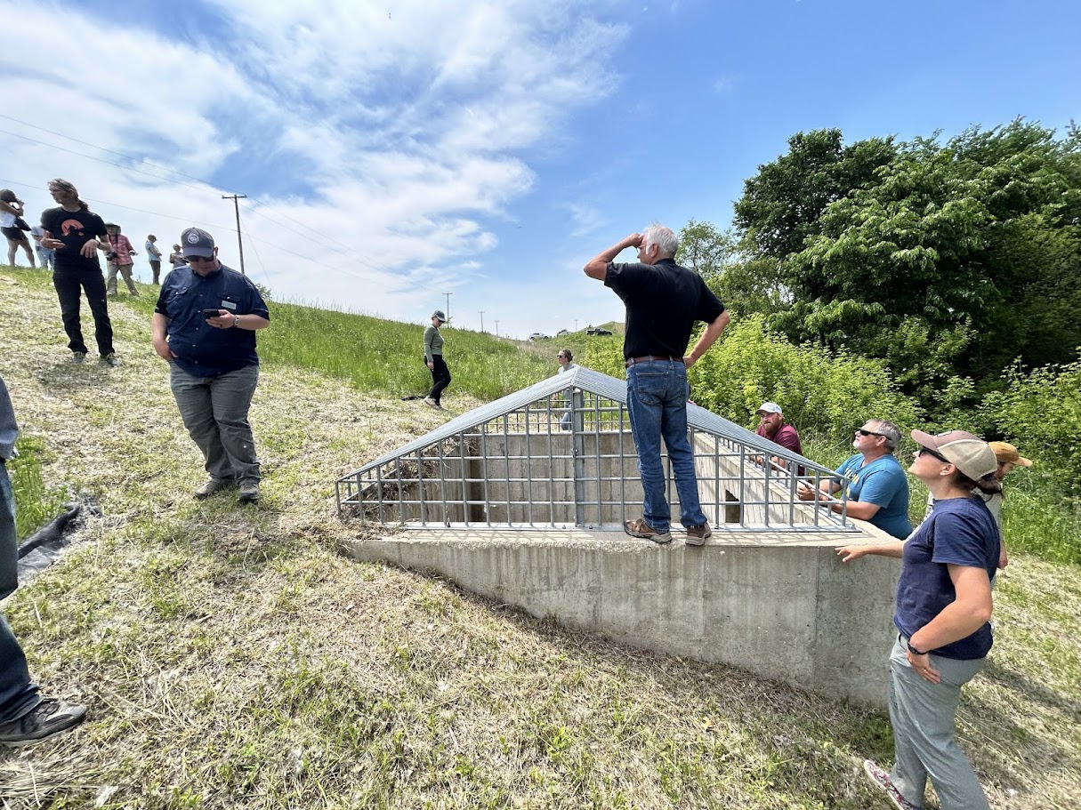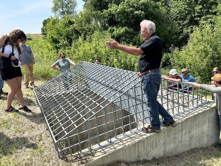 Two on-road structure (ORS) stops gave the group a chance to compare different designs and scales of these projects. Unlike traditional culverts, ORS help to temporarily hold back water instead of quickly pushing it downstream. The practice resonated with the group of collaborators, especially the CCCWC whose activities are guided by “learning to make running water walk.” The slogan was coined by Ernest Haugen, an early adaptor and major contributor to soil conservation practices in the Coon Creek Watershed. Conversations emphasized how traditional methods of moving water could slowly be replaced with ORS in the communities represented.