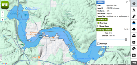 The updated flood inundation maps are available to the public through the Iowa Flood Center’s publicly accessible Iowa Flood Information System (IFIS) online tool. Users can access the maps by visiting IFIS and clicking “inundation maps,” to select their community and view adjustable flood stage heights and flood extent and depth areas. These nonregulatory maps provide valuable information to help individuals and communities prepare for and respond to potential flooding.